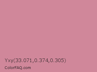 Yxy 33.071,0.374,0.305 Color is a light rose color and the nearest color is Puce #cc8899. Hex code #d0879a and RGB value is rgb(208,135,154). In RGB color space, this color is composed of 82% red, 53% green, 60% blue, In CMYK color space, this color is composed of 0% cyan, 35% magenta, 26% yellow , 18% black , In HSL color space, this color has a hue angle of 344° , 44% saturation and 67% lightness.