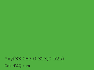 Yxy 33.083,0.313,0.525 Color is a normal green color and the nearest color is Apple #4fa83d. Hex code #50b040 and RGB value is rgb(80,176,64). In RGB color space, this color is composed of 31% red, 69% green, 25% blue, In CMYK color space, this color is composed of 55% cyan, 0% magenta, 64% yellow , 31% black , In HSL color space, this color has a hue angle of 111° , 47% saturation and 47% lightness.
