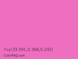 Yxy 33.091,0.368,0.243 Color is a light magenta color and the nearest color is Persian Pink #f77fbe. Hex code #ee6ebf and RGB value is rgb(238,110,191). In RGB color space, this color is composed of 93% red, 43% green, 75% blue, In CMYK color space, this color is composed of 0% cyan, 54% magenta, 20% yellow , 7% black , In HSL color space, this color has a hue angle of 322° , 79% saturation and 68% lightness.