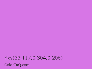 Yxy 33.117,0.304,0.206 Color is a light magenta color and the nearest color is Orchid #da70d6. Hex code #d776e6 and RGB value is rgb(215,118,230). In RGB color space, this color is composed of 84% red, 46% green, 90% blue, In CMYK color space, this color is composed of 7% cyan, 49% magenta, 0% yellow , 10% black , In HSL color space, this color has a hue angle of 292° , 69% saturation and 68% lightness.