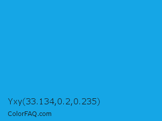 Yxy 33.134,0.2,0.235 Color is a normal blue color and the nearest color is Button Blue #24a0ed. Hex code #15a6e6 and RGB value is rgb(21,166,230). In RGB color space, this color is composed of 8% red, 65% green, 90% blue, In CMYK color space, this color is composed of 91% cyan, 28% magenta, 0% yellow , 10% black , In HSL color space, this color has a hue angle of 198° , 83% saturation and 49% lightness.