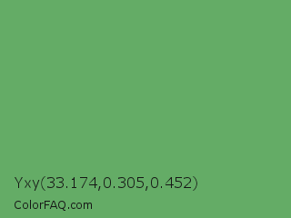 Yxy 33.174,0.305,0.452 Color is a normal green color and the nearest color is Fern #63b76c. Hex code #64ac66 and RGB value is rgb(100,172,102). In RGB color space, this color is composed of 39% red, 67% green, 40% blue, In CMYK color space, this color is composed of 42% cyan, 0% magenta, 41% yellow , 33% black , In HSL color space, this color has a hue angle of 122° , 30% saturation and 53% lightness.