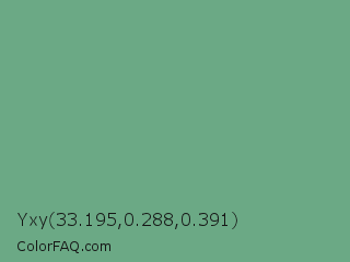 Yxy 33.195,0.288,0.391 Color is a normal green color and the nearest color is Oxley #779e86. Hex code #6ba985 and RGB value is rgb(107,169,133). In RGB color space, this color is composed of 42% red, 66% green, 52% blue, In CMYK color space, this color is composed of 37% cyan, 0% magenta, 21% yellow , 34% black , In HSL color space, this color has a hue angle of 145° , 26% saturation and 54% lightness.