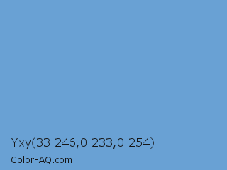 Yxy 33.246,0.233,0.254 Color is a light blue color and the nearest color is Little Boy Blue #6ca0dc. Hex code #69a1d4 and RGB value is rgb(105,161,212). In RGB color space, this color is composed of 41% red, 63% green, 83% blue, In CMYK color space, this color is composed of 50% cyan, 24% magenta, 0% yellow , 17% black , In HSL color space, this color has a hue angle of 209° , 55% saturation and 62% lightness.