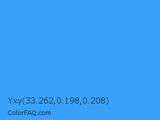 Yxy 33.262,0.198,0.208 Color is a normal blue color and the nearest color is Brilliant Azure #3399ff. Hex code #39a1fa and RGB value is rgb(57,161,250). In RGB color space, this color is composed of 22% red, 63% green, 98% blue, In CMYK color space, this color is composed of 77% cyan, 36% magenta, 0% yellow , 2% black , In HSL color space, this color has a hue angle of 208° , 95% saturation and 60% lightness.