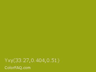 Yxy 33.27,0.404,0.51 Color is a normal yellow color and the nearest color is Citron #9fa91f. Hex code #98a412 and RGB value is rgb(152,164,18). In RGB color space, this color is composed of 60% red, 64% green, 7% blue, In CMYK color space, this color is composed of 7% cyan, 0% magenta, 89% yellow , 36% black , In HSL color space, this color has a hue angle of 65° , 80% saturation and 36% lightness.
