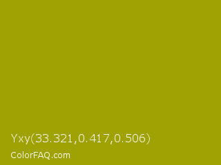 Yxy 33.321,0.417,0.506 Color is a normal yellow color and the nearest color is Apple Green #8db600. Hex code #a0a203 and RGB value is rgb(160,162,3). In RGB color space, this color is composed of 63% red, 64% green, 1% blue, In CMYK color space, this color is composed of 1% cyan, 0% magenta, 98% yellow , 36% black , In HSL color space, this color has a hue angle of 61° , 96% saturation and 32% lightness.