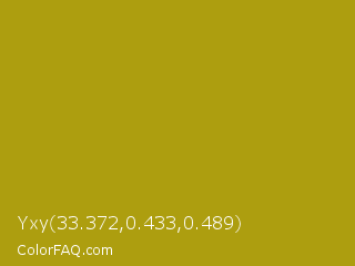Yxy 33.372,0.433,0.489 Color is a normal yellow color and the nearest color is Sahara #b7a214. Hex code #ad9e0f and RGB value is rgb(173,158,15). In RGB color space, this color is composed of 68% red, 62% green, 6% blue, In CMYK color space, this color is composed of 0% cyan, 9% magenta, 91% yellow , 32% black , In HSL color space, this color has a hue angle of 54° , 84% saturation and 37% lightness.