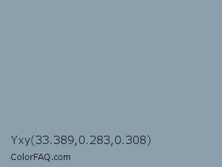 Yxy 33.389,0.283,0.308 Color is a light blue color and the nearest color is Bali Hai #859faf. Hex code #8b9fad and RGB value is rgb(139,159,173). In RGB color space, this color is composed of 55% red, 62% green, 68% blue, In CMYK color space, this color is composed of 20% cyan, 8% magenta, 0% yellow , 32% black , In HSL color space, this color has a hue angle of 205° , 17% saturation and 61% lightness.