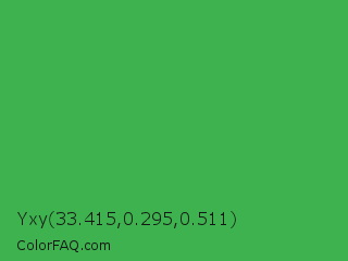 Yxy 33.415,0.295,0.511 Color is a normal green color and the nearest color is Chateau Green #40a860. Hex code #3eb24e and RGB value is rgb(62,178,78). In RGB color space, this color is composed of 24% red, 70% green, 31% blue, In CMYK color space, this color is composed of 65% cyan, 0% magenta, 56% yellow , 30% black , In HSL color space, this color has a hue angle of 128° , 48% saturation and 47% lightness.