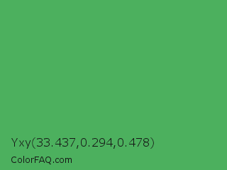Yxy 33.437,0.294,0.478 Color is a normal green color and the nearest color is Chateau Green #40a860. Hex code #4cb05e and RGB value is rgb(76,176,94). In RGB color space, this color is composed of 30% red, 69% green, 37% blue, In CMYK color space, this color is composed of 57% cyan, 0% magenta, 47% yellow , 31% black , In HSL color space, this color has a hue angle of 131° , 40% saturation and 49% lightness.