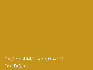 Yxy 33.444,0.465,0.457 Color is a normal orange color and the nearest color is Pizza #c99415. Hex code #c5951b and RGB value is rgb(197,149,27). In RGB color space, this color is composed of 77% red, 58% green, 11% blue, In CMYK color space, this color is composed of 0% cyan, 24% magenta, 86% yellow , 23% black , In HSL color space, this color has a hue angle of 43° , 76% saturation and 44% lightness.