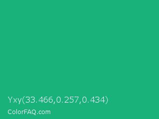 Yxy 33.466,0.257,0.434 Color is a normal green color and the nearest color is Green Crayola #1cac78. Hex code #18b27a and RGB value is rgb(24,178,122). In RGB color space, this color is composed of 9% red, 70% green, 48% blue, In CMYK color space, this color is composed of 87% cyan, 0% magenta, 31% yellow , 30% black , In HSL color space, this color has a hue angle of 158° , 76% saturation and 40% lightness.