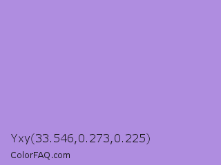 Yxy 33.546,0.273,0.225 Color is a light violet color and the nearest color is Dull Lavender #a899e6. Hex code #af8de0 and RGB value is rgb(175,141,224). In RGB color space, this color is composed of 69% red, 55% green, 88% blue, In CMYK color space, this color is composed of 22% cyan, 37% magenta, 0% yellow , 12% black , In HSL color space, this color has a hue angle of 265° , 57% saturation and 72% lightness.