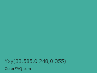 Yxy 33.585,0.248,0.355 Color is a normal cyan color and the nearest color is Keppel #3ab09e. Hex code #43ad9e and RGB value is rgb(67,173,158). In RGB color space, this color is composed of 26% red, 68% green, 62% blue, In CMYK color space, this color is composed of 61% cyan, 0% magenta, 9% yellow , 32% black , In HSL color space, this color has a hue angle of 172° , 44% saturation and 47% lightness.