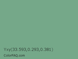 Yxy 33.593,0.293,0.381 Color is a normal green color and the nearest color is Bay Leaf #7da98d. Hex code #75a889 and RGB value is rgb(117,168,137). In RGB color space, this color is composed of 46% red, 66% green, 54% blue, In CMYK color space, this color is composed of 30% cyan, 0% magenta, 18% yellow , 34% black , In HSL color space, this color has a hue angle of 144° , 23% saturation and 56% lightness.