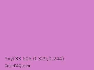 Yxy 33.606,0.329,0.244 Color is a light magenta color and the nearest color is French Mauve #d473d4. Hex code #d480c8 and RGB value is rgb(212,128,200). In RGB color space, this color is composed of 83% red, 50% green, 78% blue, In CMYK color space, this color is composed of 0% cyan, 40% magenta, 6% yellow , 17% black , In HSL color space, this color has a hue angle of 309° , 49% saturation and 67% lightness.