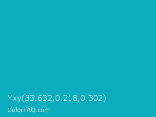 Yxy 33.632,0.218,0.302 Color is a normal cyan color and the nearest color is Tiffany Blue #0abab5. Hex code #0badbd and RGB value is rgb(11,173,189). In RGB color space, this color is composed of 4% red, 68% green, 74% blue, In CMYK color space, this color is composed of 94% cyan, 8% magenta, 0% yellow , 26% black , In HSL color space, this color has a hue angle of 185° , 89% saturation and 39% lightness.