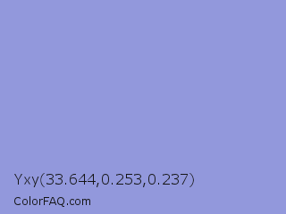 Yxy 33.644,0.253,0.237 Color is a light blue color and the nearest color is Ceil #92a1cf. Hex code #9298dc and RGB value is rgb(146,152,220). In RGB color space, this color is composed of 57% red, 60% green, 86% blue, In CMYK color space, this color is composed of 34% cyan, 31% magenta, 0% yellow , 14% black , In HSL color space, this color has a hue angle of 235° , 51% saturation and 72% lightness.