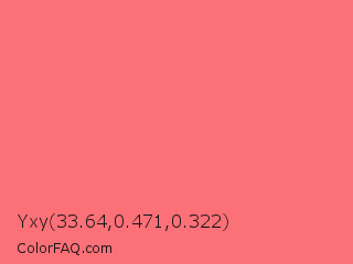 Yxy 33.64,0.471,0.322 Color is a light red color and the nearest color is Begonia #fa6e79. Hex code #fc7078 and RGB value is rgb(252,112,120). In RGB color space, this color is composed of 99% red, 44% green, 47% blue, In CMYK color space, this color is composed of 0% cyan, 56% magenta, 52% yellow , 1% black , In HSL color space, this color has a hue angle of 357° , 96% saturation and 71% lightness.