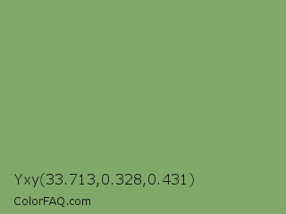Yxy 33.713,0.328,0.431 Color is a normal green color and the nearest color is Asparagus #87a96b. Hex code #81a86a and RGB value is rgb(129,168,106). In RGB color space, this color is composed of 51% red, 66% green, 42% blue, In CMYK color space, this color is composed of 23% cyan, 0% magenta, 37% yellow , 34% black , In HSL color space, this color has a hue angle of 98° , 26% saturation and 54% lightness.