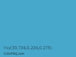 Yxy 33.734,0.224,0.275 Color is a normal blue color and the nearest color is Maximum Blue #47abcc. Hex code #48a8cb and RGB value is rgb(72,168,203). In RGB color space, this color is composed of 28% red, 66% green, 80% blue, In CMYK color space, this color is composed of 65% cyan, 17% magenta, 0% yellow , 20% black , In HSL color space, this color has a hue angle of 196° , 56% saturation and 54% lightness.