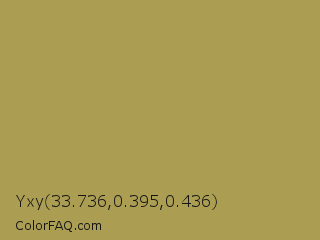 Yxy 33.736,0.395,0.436 Color is a normal yellow color and the nearest color is Husk #b7a458. Hex code #ab9e53 and RGB value is rgb(171,158,83). In RGB color space, this color is composed of 67% red, 62% green, 33% blue, In CMYK color space, this color is composed of 0% cyan, 8% magenta, 51% yellow , 33% black , In HSL color space, this color has a hue angle of 51° , 35% saturation and 50% lightness.