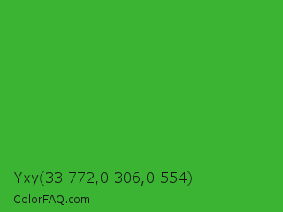 Yxy 33.772,0.306,0.554 Color is a normal green color and the nearest color is Wageningen Green #34b233. Hex code #3ab432 and RGB value is rgb(58,180,50). In RGB color space, this color is composed of 23% red, 71% green, 20% blue, In CMYK color space, this color is composed of 68% cyan, 0% magenta, 72% yellow , 29% black , In HSL color space, this color has a hue angle of 116° , 57% saturation and 45% lightness.