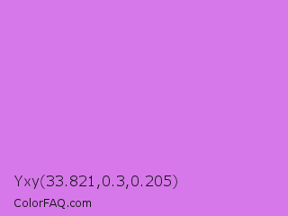 Yxy 33.821,0.3,0.205 Color is a light purple color and the nearest color is Orchid #da70d6. Hex code #d778ea and RGB value is rgb(215,120,234). In RGB color space, this color is composed of 84% red, 47% green, 92% blue, In CMYK color space, this color is composed of 8% cyan, 49% magenta, 0% yellow , 8% black , In HSL color space, this color has a hue angle of 290° , 73% saturation and 69% lightness.