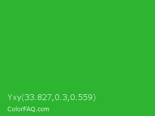 Yxy 33.827,0.3,0.559 Color is a normal green color and the nearest color is Wageningen Green #34b233. Hex code #2db531 and RGB value is rgb(45,181,49). In RGB color space, this color is composed of 18% red, 71% green, 19% blue, In CMYK color space, this color is composed of 75% cyan, 0% magenta, 73% yellow , 29% black , In HSL color space, this color has a hue angle of 122° , 60% saturation and 44% lightness.