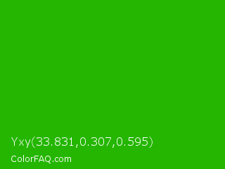 Yxy 33.831,0.307,0.595 Color is a normal green color and the nearest color is Slimy Green #299617. Hex code #24b600 and RGB value is rgb(36,182,0). In RGB color space, this color is composed of 14% red, 71% green, 0% blue, In CMYK color space, this color is composed of 80% cyan, 0% magenta, 100% yellow , 29% black , In HSL color space, this color has a hue angle of 108° , 100% saturation and 36% lightness.