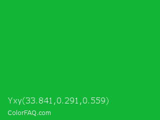 Yxy 33.841,0.291,0.559 Color is a normal green color and the nearest color is Dark Pastel Green #03c03c. Hex code #11b636 and RGB value is rgb(17,182,54). In RGB color space, this color is composed of 7% red, 71% green, 21% blue, In CMYK color space, this color is composed of 91% cyan, 0% magenta, 70% yellow , 29% black , In HSL color space, this color has a hue angle of 133° , 83% saturation and 39% lightness.