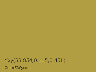 Yxy 33.854,0.415,0.451 Color is a normal yellow color and the nearest color is Brass #b5a642. Hex code #b19d42 and RGB value is rgb(177,157,66). In RGB color space, this color is composed of 69% red, 62% green, 26% blue, In CMYK color space, this color is composed of 0% cyan, 11% magenta, 63% yellow , 31% black , In HSL color space, this color has a hue angle of 49° , 46% saturation and 48% lightness.