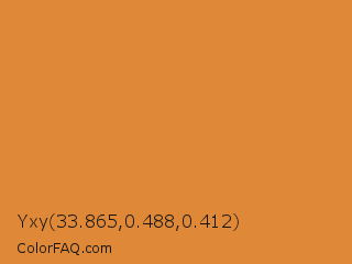 Yxy 33.865,0.488,0.412 Color is a normal orange color and the nearest color is Tigers Eye #e08d3c. Hex code #df8938 and RGB value is rgb(223,137,56). In RGB color space, this color is composed of 87% red, 54% green, 22% blue, In CMYK color space, this color is composed of 0% cyan, 39% magenta, 75% yellow , 13% black , In HSL color space, this color has a hue angle of 29° , 72% saturation and 55% lightness.