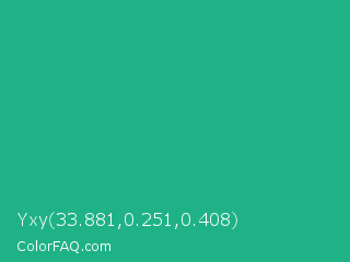 Yxy 33.881,0.251,0.408 Color is a normal green color and the nearest color is Mountain Meadow Crayola #1ab385. Hex code #1fb287 and RGB value is rgb(31,178,135). In RGB color space, this color is composed of 12% red, 70% green, 53% blue, In CMYK color space, this color is composed of 83% cyan, 0% magenta, 24% yellow , 30% black , In HSL color space, this color has a hue angle of 162° , 70% saturation and 41% lightness.