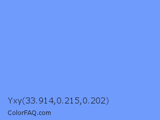 Yxy 33.914,0.215,0.202 Color is a light blue color and the nearest color is Cornflower Blue #6495ed. Hex code #6f9bfd and RGB value is rgb(111,155,253). In RGB color space, this color is composed of 44% red, 61% green, 99% blue, In CMYK color space, this color is composed of 56% cyan, 39% magenta, 0% yellow , 1% black , In HSL color space, this color has a hue angle of 221° , 97% saturation and 71% lightness.