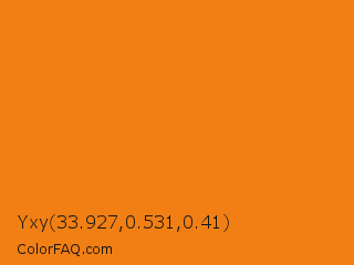 Yxy 33.927,0.531,0.41 Color is a normal orange color and the nearest color is Tango #ed7a1c. Hex code #f17f14 and RGB value is rgb(241,127,20). In RGB color space, this color is composed of 95% red, 50% green, 8% blue, In CMYK color space, this color is composed of 0% cyan, 47% magenta, 92% yellow , 5% black , In HSL color space, this color has a hue angle of 29° , 89% saturation and 51% lightness.