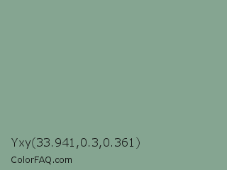 Yxy 33.941,0.3,0.361 Color is a normal green color and the nearest color is Envy #8ba690. Hex code #85a591 and RGB value is rgb(133,165,145). In RGB color space, this color is composed of 52% red, 65% green, 57% blue, In CMYK color space, this color is composed of 19% cyan, 0% magenta, 12% yellow , 35% black , In HSL color space, this color has a hue angle of 143° , 15% saturation and 58% lightness.