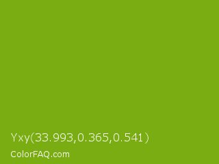Yxy 33.993,0.365,0.541 Color is a normal green color and the nearest color is Lima #76bd17. Hex code #79ad12 and RGB value is rgb(121,173,18). In RGB color space, this color is composed of 47% red, 68% green, 7% blue, In CMYK color space, this color is composed of 30% cyan, 0% magenta, 90% yellow , 32% black , In HSL color space, this color has a hue angle of 80° , 81% saturation and 37% lightness.