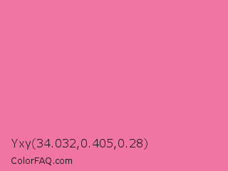 Yxy 34.032,0.405,0.28 Color is a light rose color and the nearest color is Cyclamen #f56fa1. Hex code #f175a2 and RGB value is rgb(241,117,162). In RGB color space, this color is composed of 95% red, 46% green, 64% blue, In CMYK color space, this color is composed of 0% cyan, 51% magenta, 33% yellow , 5% black , In HSL color space, this color has a hue angle of 338° , 82% saturation and 70% lightness.