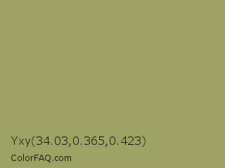 Yxy 34.03,0.365,0.423 Color is a normal yellow color and the nearest color is Green Smoke #a4af6e. Hex code #9ea264 and RGB value is rgb(158,162,100). In RGB color space, this color is composed of 62% red, 64% green, 39% blue, In CMYK color space, this color is composed of 2% cyan, 0% magenta, 38% yellow , 36% black , In HSL color space, this color has a hue angle of 64° , 25% saturation and 51% lightness.