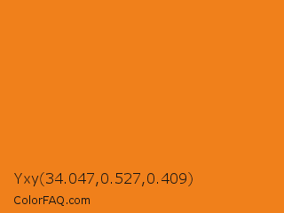 Yxy 34.047,0.527,0.409 Color is a normal orange color and the nearest color is Tango #ed7a1c. Hex code #f0801b and RGB value is rgb(240,128,27). In RGB color space, this color is composed of 94% red, 50% green, 11% blue, In CMYK color space, this color is composed of 0% cyan, 47% magenta, 89% yellow , 6% black , In HSL color space, this color has a hue angle of 28° , 88% saturation and 52% lightness.