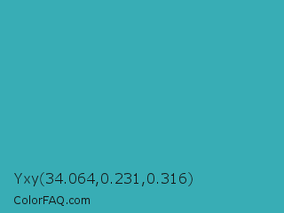 Yxy 34.064,0.231,0.316 Color is a normal cyan color and the nearest color is Pelorous #3eabbf. Hex code #38adb5 and RGB value is rgb(56,173,181). In RGB color space, this color is composed of 22% red, 68% green, 71% blue, In CMYK color space, this color is composed of 69% cyan, 4% magenta, 0% yellow , 29% black , In HSL color space, this color has a hue angle of 184° , 53% saturation and 46% lightness.