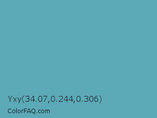 Yxy 34.07,0.244,0.306 Color is a normal cyan color and the nearest color is Fountain Blue #56b4be. Hex code #5ca9b7 and RGB value is rgb(92,169,183). In RGB color space, this color is composed of 36% red, 66% green, 72% blue, In CMYK color space, this color is composed of 50% cyan, 8% magenta, 0% yellow , 28% black , In HSL color space, this color has a hue angle of 189° , 39% saturation and 54% lightness.