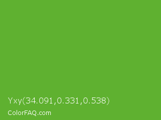 Yxy 34.091,0.331,0.538 Color is a normal green color and the nearest color is Green RYB #66b032. Hex code #5fb130 and RGB value is rgb(95,177,48). In RGB color space, this color is composed of 37% red, 69% green, 19% blue, In CMYK color space, this color is composed of 46% cyan, 0% magenta, 73% yellow , 31% black , In HSL color space, this color has a hue angle of 98° , 57% saturation and 44% lightness.