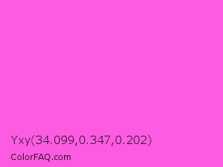 Yxy 34.099,0.347,0.202 Color is a light magenta color and the nearest color is Purple Pizzazz #fe4eda. Hex code #fe5be3 and RGB value is rgb(254,91,227). In RGB color space, this color is composed of 100% red, 36% green, 89% blue, In CMYK color space, this color is composed of 0% cyan, 64% magenta, 11% yellow , 0% black , In HSL color space, this color has a hue angle of 310° , 99% saturation and 68% lightness.