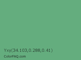 Yxy 34.103,0.288,0.41 Color is a normal green color and the nearest color is Shiny Shamrock #5fa778. Hex code #64ad7e and RGB value is rgb(100,173,126). In RGB color space, this color is composed of 39% red, 68% green, 49% blue, In CMYK color space, this color is composed of 42% cyan, 0% magenta, 27% yellow , 32% black , In HSL color space, this color has a hue angle of 141° , 31% saturation and 54% lightness.
