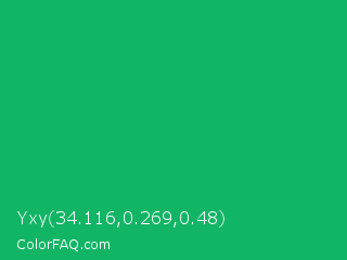 Yxy 34.116,0.269,0.48 Color is a normal green color and the nearest color is GO Green #00ab66. Hex code #12b565 and RGB value is rgb(18,181,101). In RGB color space, this color is composed of 7% red, 71% green, 40% blue, In CMYK color space, this color is composed of 90% cyan, 0% magenta, 44% yellow , 29% black , In HSL color space, this color has a hue angle of 151° , 82% saturation and 39% lightness.
