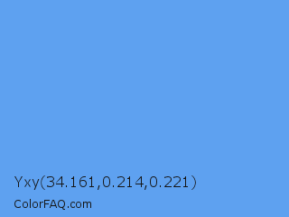 Yxy 34.161,0.214,0.221 Color is a light blue color and the nearest color is Blue Jeans #5dadec. Hex code #5ea1f0 and RGB value is rgb(94,161,240). In RGB color space, this color is composed of 37% red, 63% green, 94% blue, In CMYK color space, this color is composed of 61% cyan, 33% magenta, 0% yellow , 6% black , In HSL color space, this color has a hue angle of 212° , 83% saturation and 65% lightness.