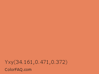 Yxy 34.161,0.471,0.372 Color is a light orange color and the nearest color is Big Foot Feet #e88e5a. Hex code #e8835c and RGB value is rgb(232,131,92). In RGB color space, this color is composed of 91% red, 51% green, 36% blue, In CMYK color space, this color is composed of 0% cyan, 44% magenta, 60% yellow , 9% black , In HSL color space, this color has a hue angle of 17° , 75% saturation and 64% lightness.